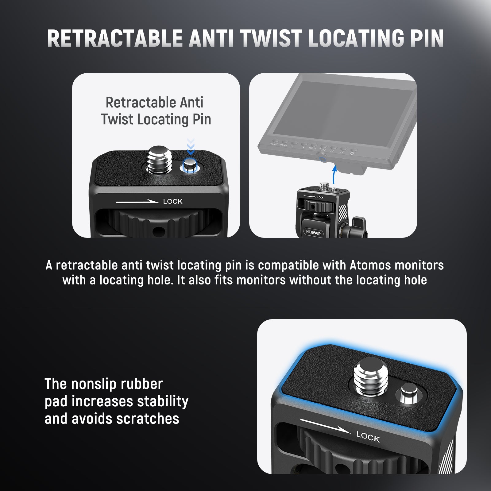 - Retractable Anti Twist Locating Pin- A retractable anti twist locating pin is compatible with Atomos Ninja V Ninja V+ and other monitors with a locating hole, or NEEWER F100 F200 F400 Pro F500 monitors without a locating hole. The nonslip rubber pad adds stability and prevents scratches