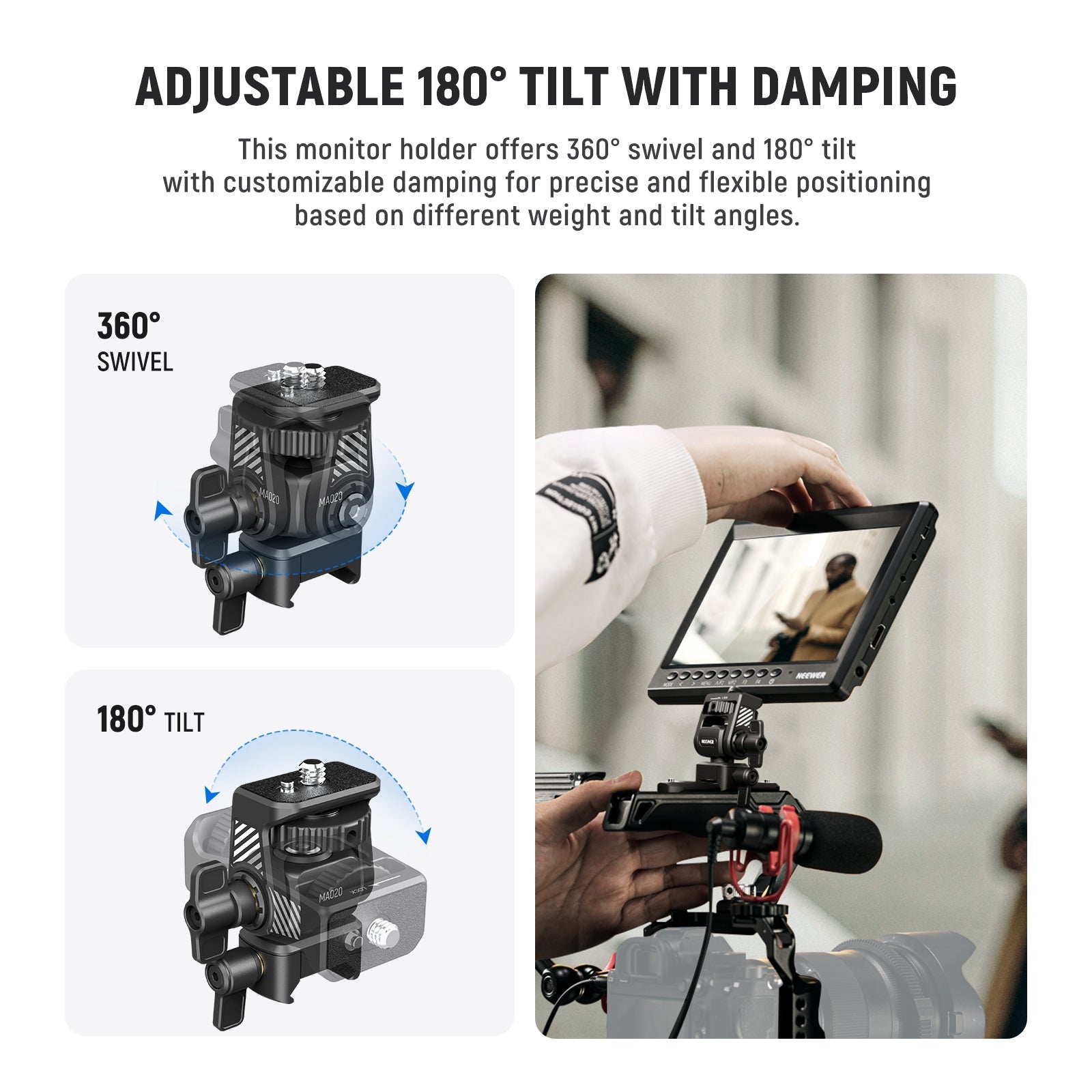 - Adjustable 360° Swivel & 180° Tilt- This field monitor holder offers 360° swivel and 180° tilt with adjustable damping for precise and flexible positioning based on different weight and tilt angles. The side knob enables a quick adjustment simply by hand