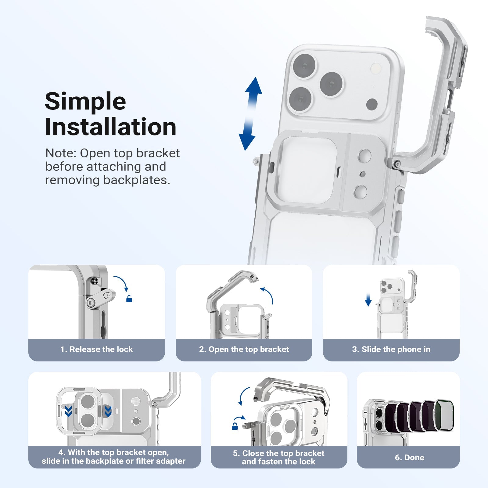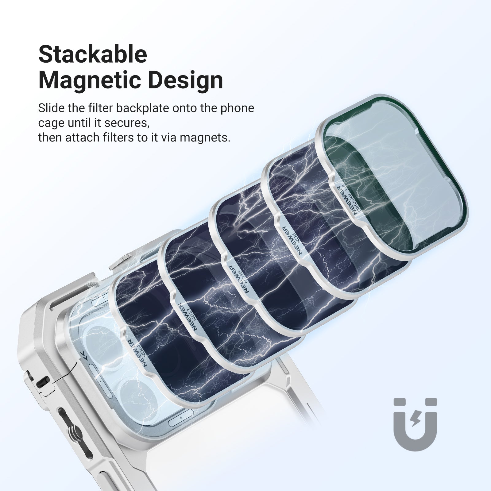 - Stackable Magnetic Design- Slide the filter backplate onto the phone cage until it secures, then attach filters to it via magnets. Stack multiple filters for creative effects. Note: Open the cage's top bracket before installing the backplate