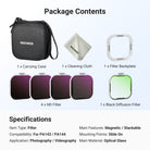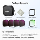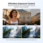 - Effortless Exposure Control- ND filters reduce light by 3, 4, 5, and 6 stops for exposure balance in various conditions, letting you capture movements with motion blur. Note: Use professional apps (like Blackmagic Camera) to prevent auto exposure reset