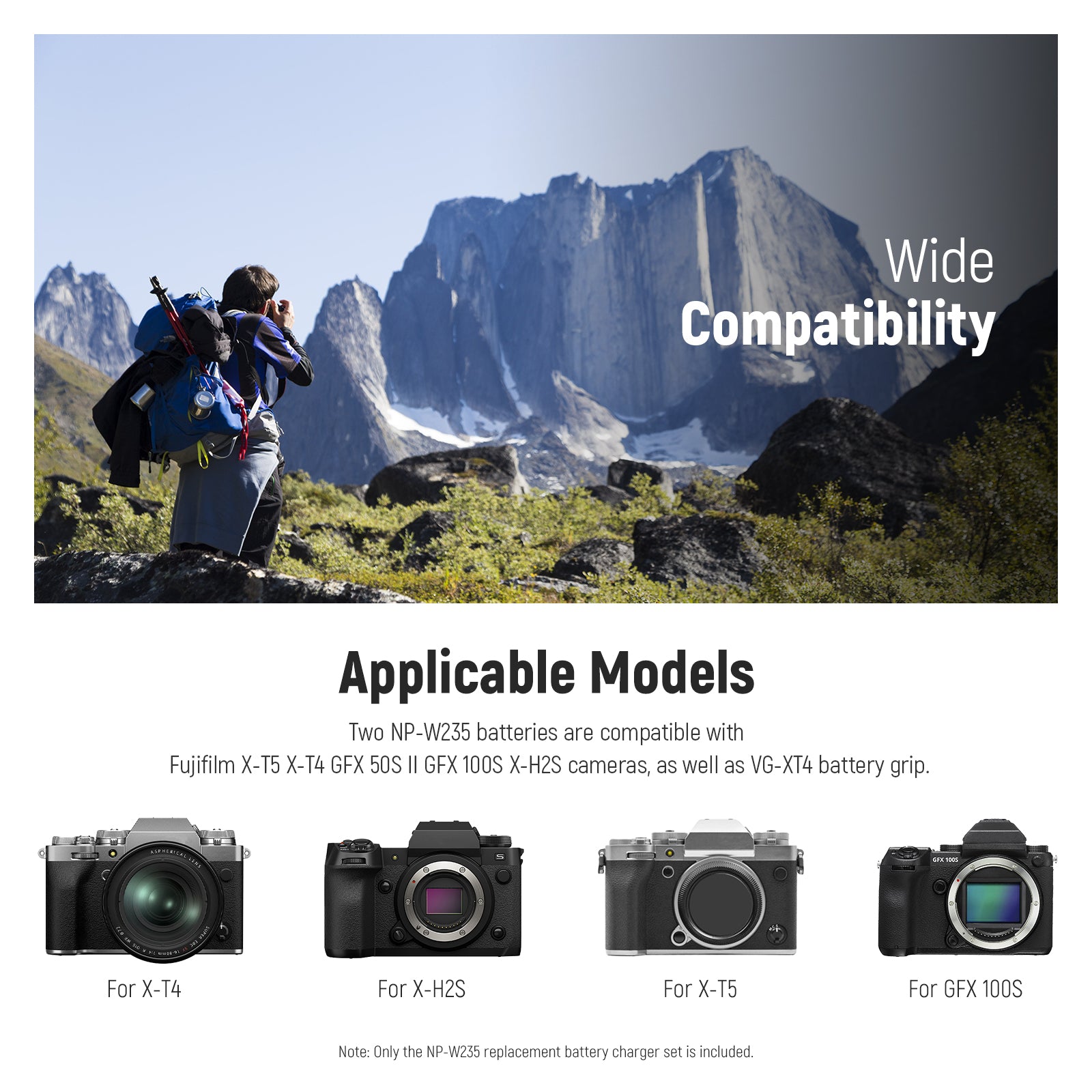 - Fully Compatible with Fujifilm- Equally powerful replacement for original NP-W235 battery, the two rechargeable camera batteries are fully compatible with Fujifilm X-T5 X-T4 GFX 50S II GFX 100S X-H2S cameras, as well as VG-XT4 battery grip