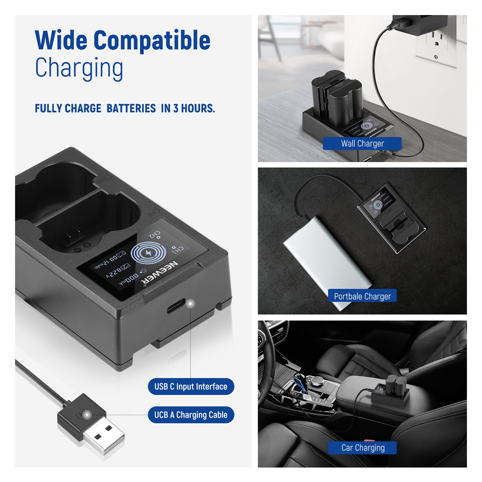 - Convenient Dual Slot USB Charger- The included USB battery charger allows you to charge the NP-W235 batteries in more than one way. With USB Type C port, a USB Type C to Type A cable, and a fixed USB Type A cable, easily connect the battery charger to a wall socket, car charger, or even a portable charger. The dual slot design lets you charge the two batteries simultaneously. Quick charge in 3 hours, whether with one battery or two batteries inserted