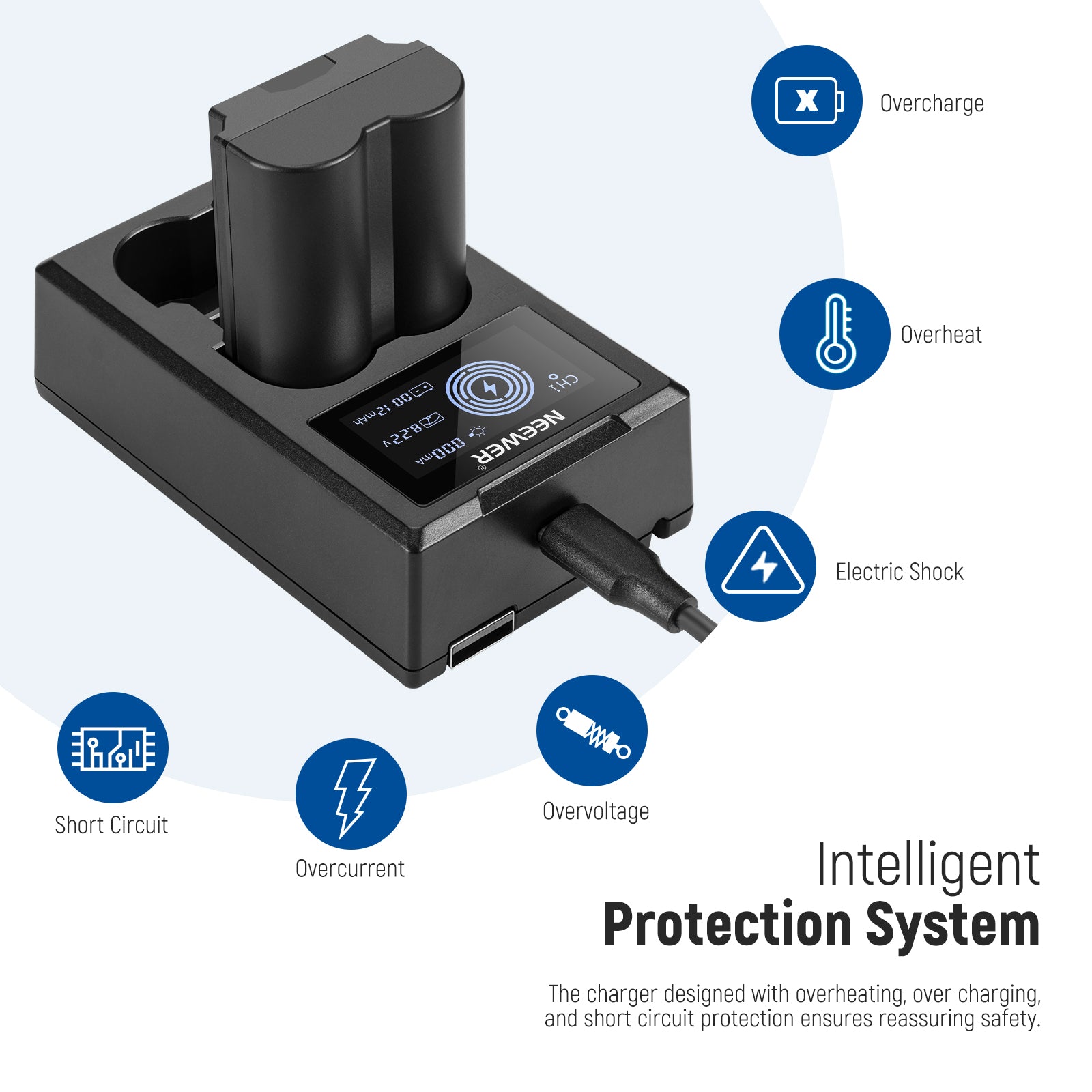 - Easy to Read LCD Display- The charges includes a LCD display to clearly show the real time charging progress, charging voltage, and other information for the two charger slots. With 5V/2.1A charging input, the charger effectively protects the batteries from overcharging, over heating, over current, over voltage, short circuit, and electronic shock