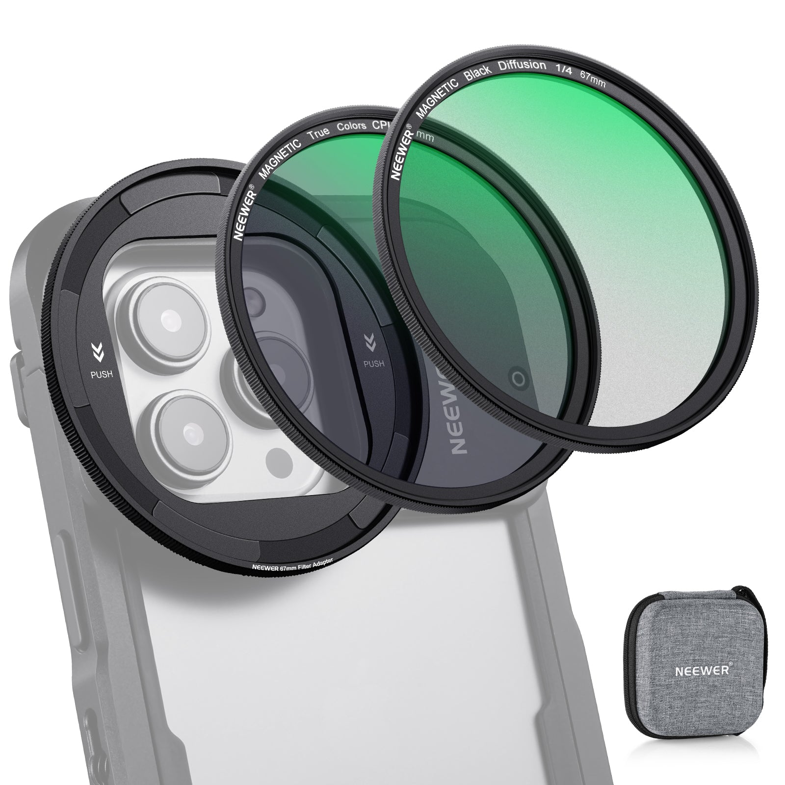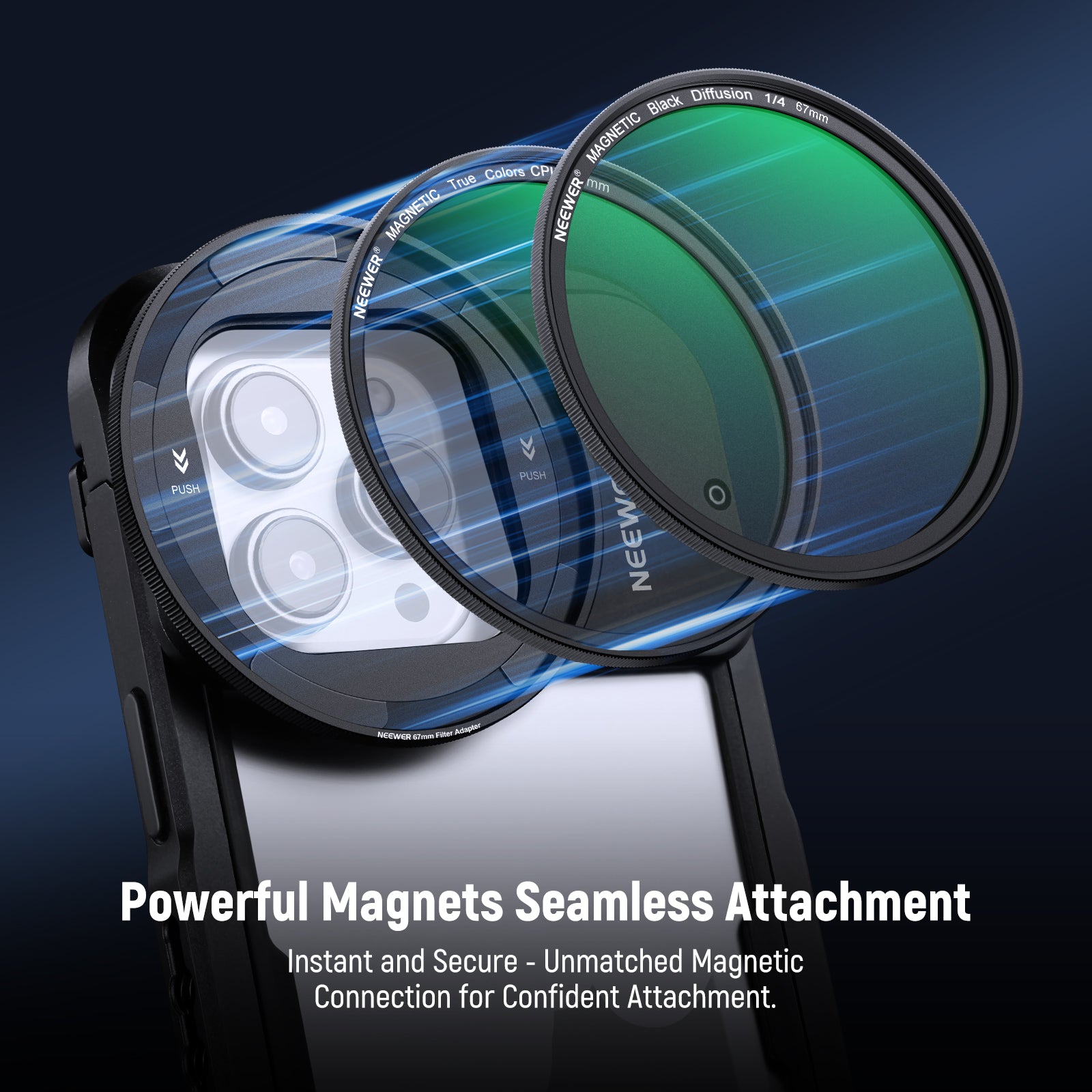 - Specialized Magnetic Filter System for iPhone 15 Series- Snap this dedicated magnetic filter adapter ring to the lens back plate of NEEWER PA023 phone cage for 15 Pro and PA024 phone cage for 15 Pro Max for instant, secure filter changes.The upgraded structure is compatible with most 67mm magnetic filters, even a rotatable VND filter(not included), offering a complete phone lens filter solution with just a single adapter ring