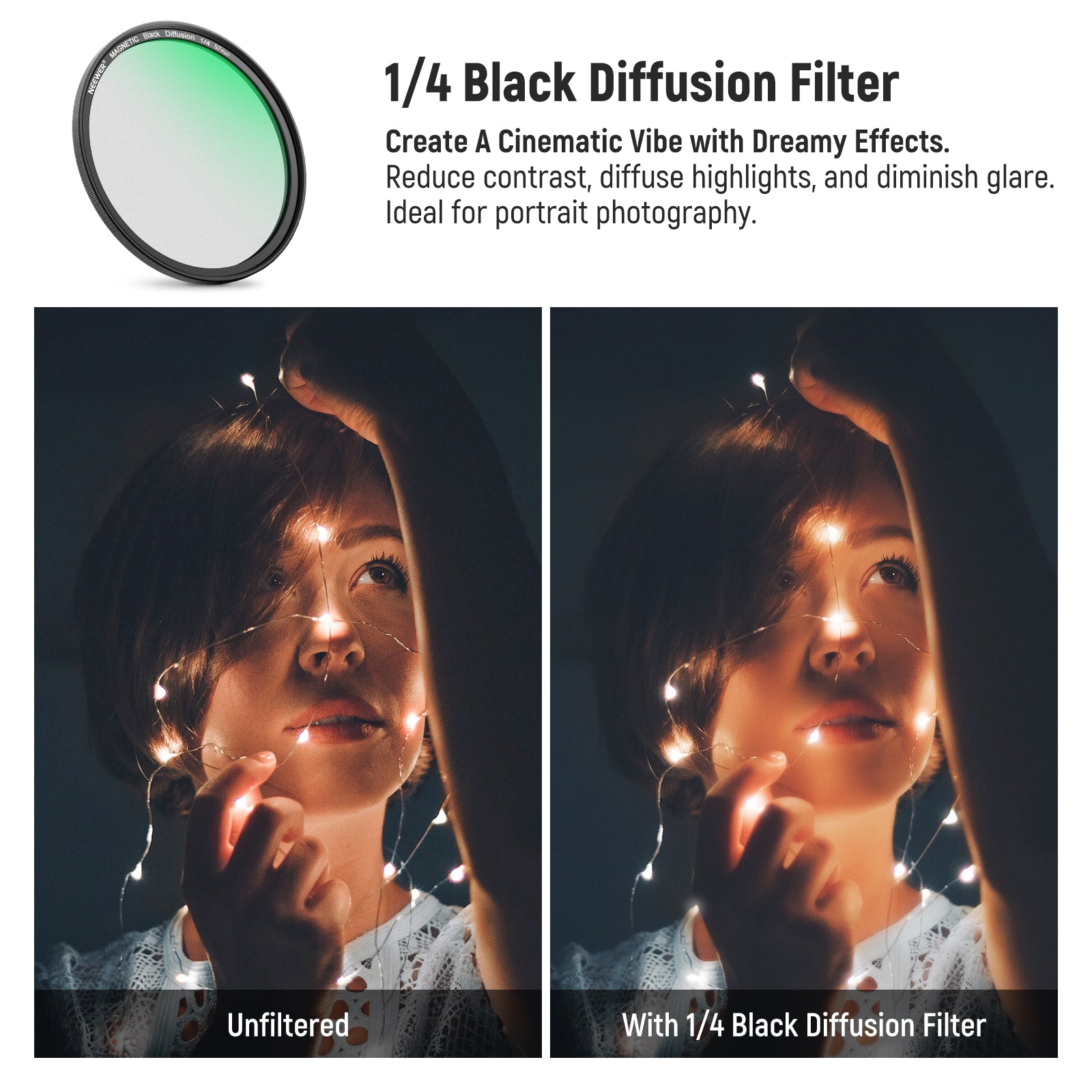 - 1/4 Black Diffusion Filter for Cinematic Effect- The 1/4 stop black diffusion filter effectively reduces highlights and lowers glare, delivering smoother and softer skin tones for a dreamy cinematic effect in video and photo images. It helps you create a romantic vibe using your phone lens. Ideal for portrait photography, video recording, and vlogging