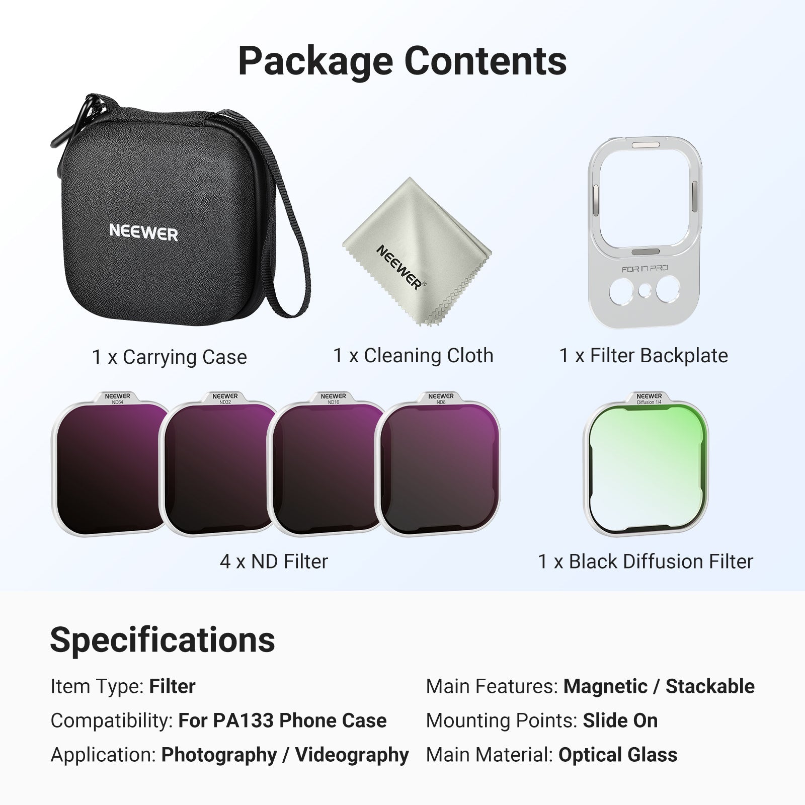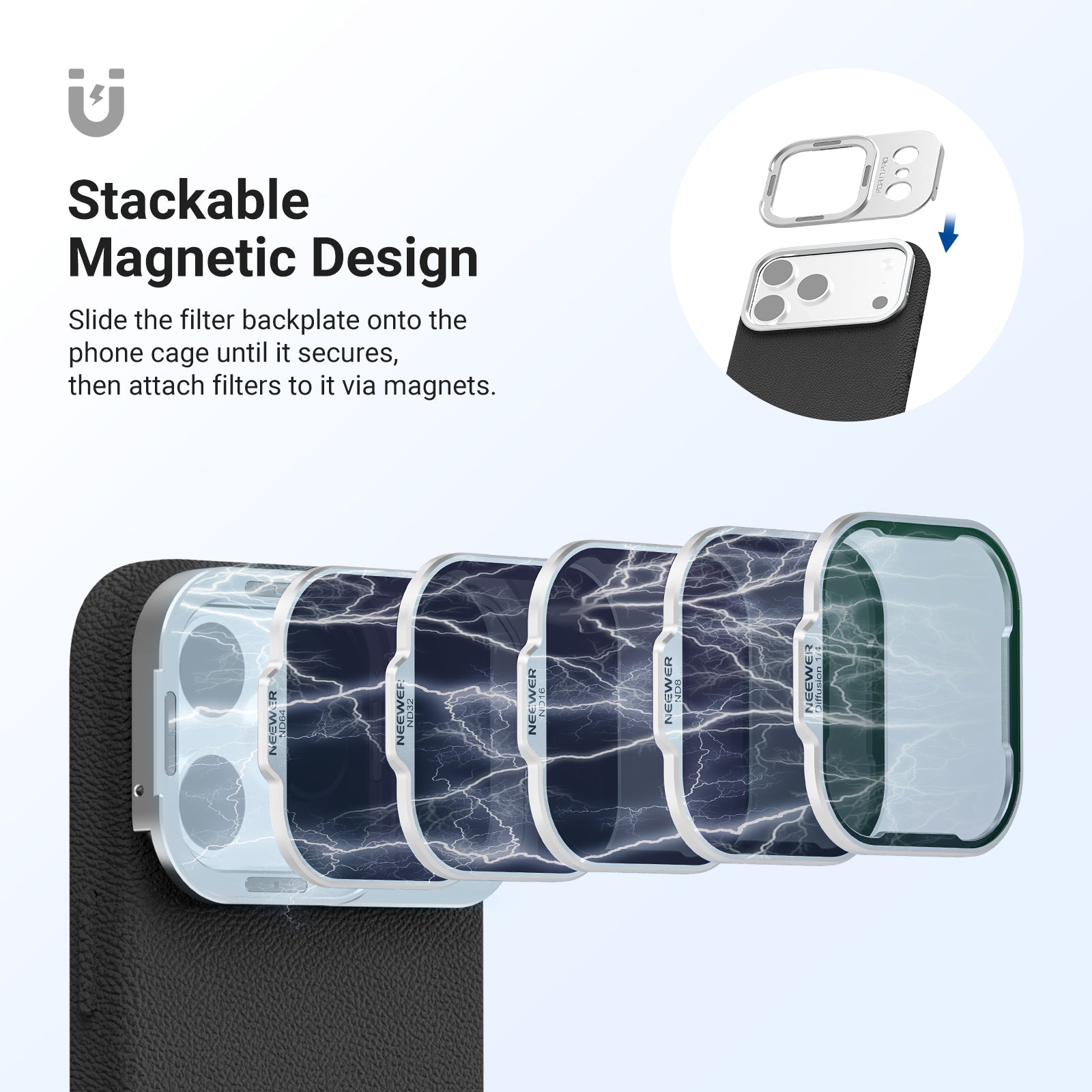 - 17mm Phone Lens Backplate- Designed for the Main and Telephoto Cameras, it suits all NEEWER 17mm threaded phone lenses, including 105mm macro, 10x macro, 8mm fisheye, 45x microscope, 7x telephoto, 18mm wide angle, 1.55x blue anamorphic (Note: Lenses sold separately. Remove the mounted lens before detaching the backplate)