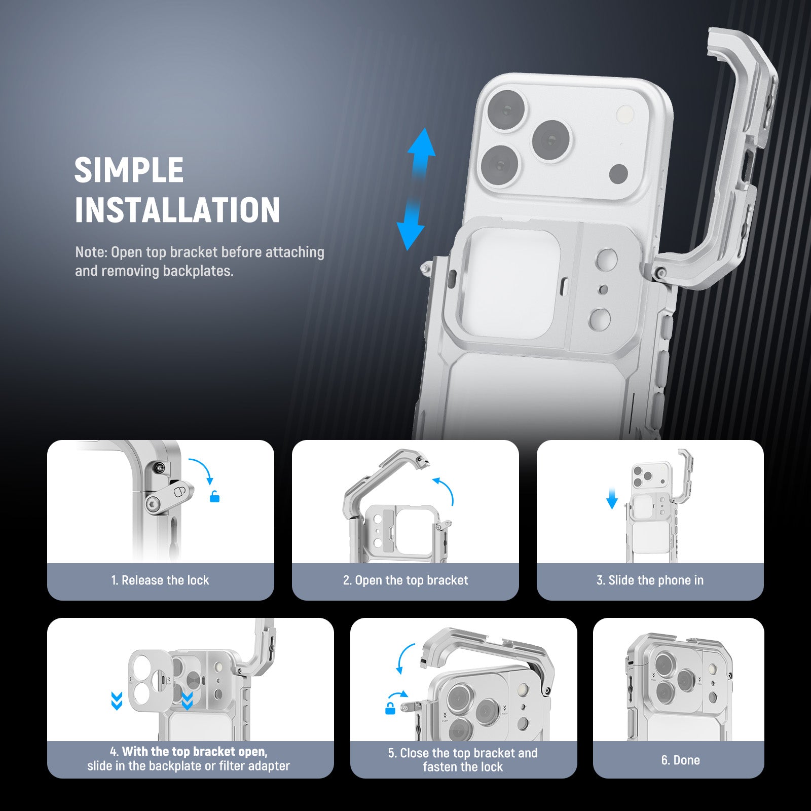 - Compatible with iPhone 17 Pro/Pro Max - This aluminum alloy cell phone cage video rig with shockproof rubber linings shields your phone during video recording, YouTube/TikTok vlogging, live streaming, mobile photography, and filmmaking like a gimbal stabilizer holder equipment as professional smartphone camera filming accessories. It includes three interchangeable backplates to connect filters and lenses for unlimited creativity. Note: Open the top bracket to install a backplate, then close it to secure