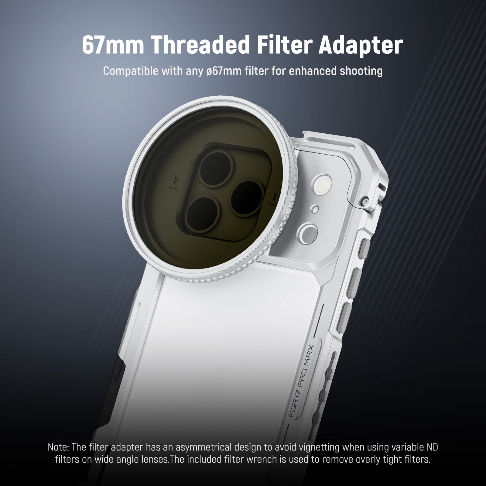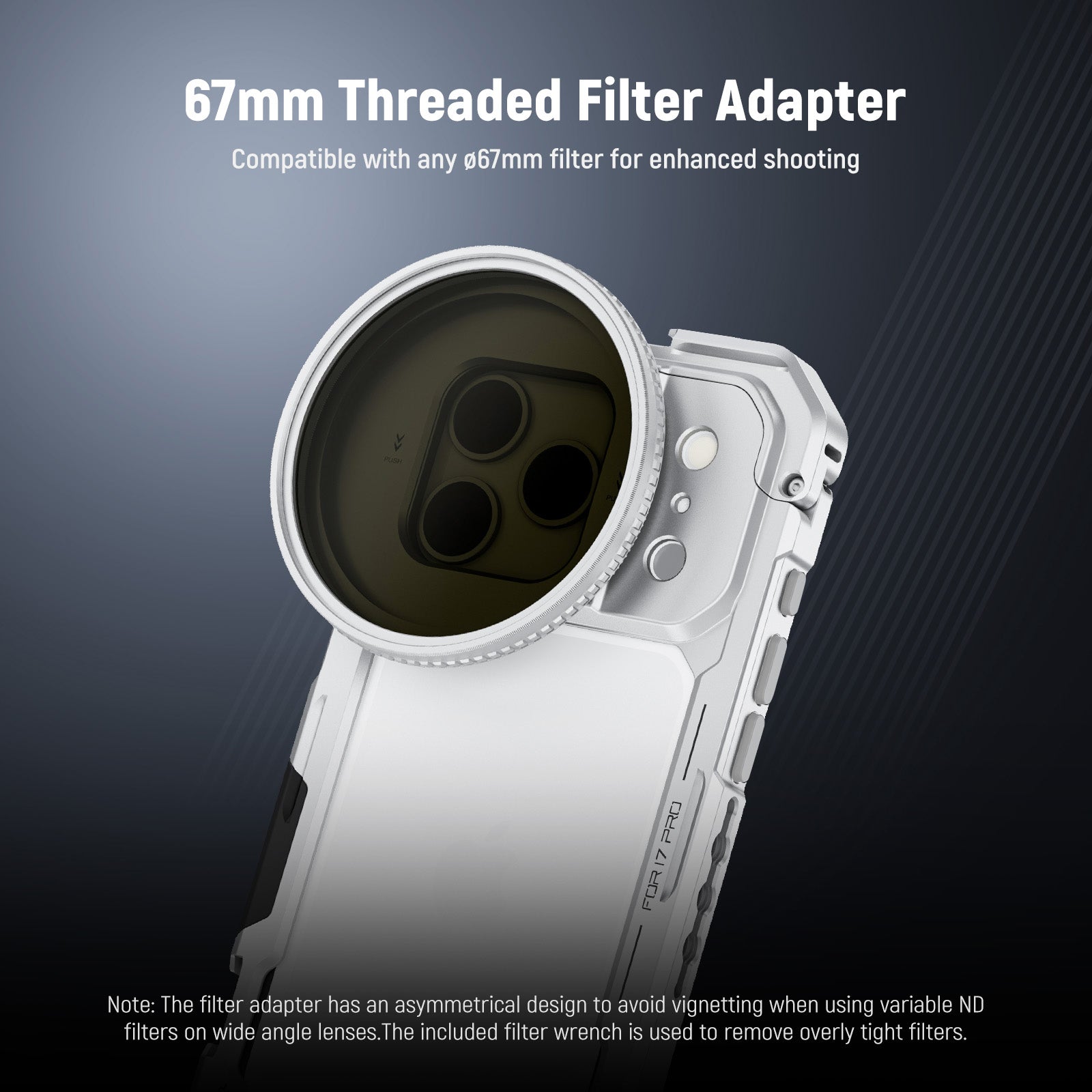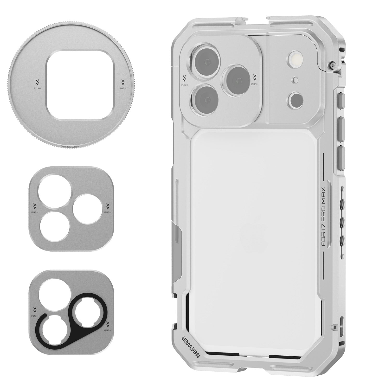- 17mm Phone Lens Backplate - Mounts 105mm macro, 10x macro, 8mm fisheye, 45x microscope with LED light, 7x telephoto, 60mm telephoto, 18mm wide angle, 1.55x blue anamorphic, and other 17mm threaded NEEWER phone attachment lenses to the Main Camera and Telephoto Camera (lenses sold separately)
