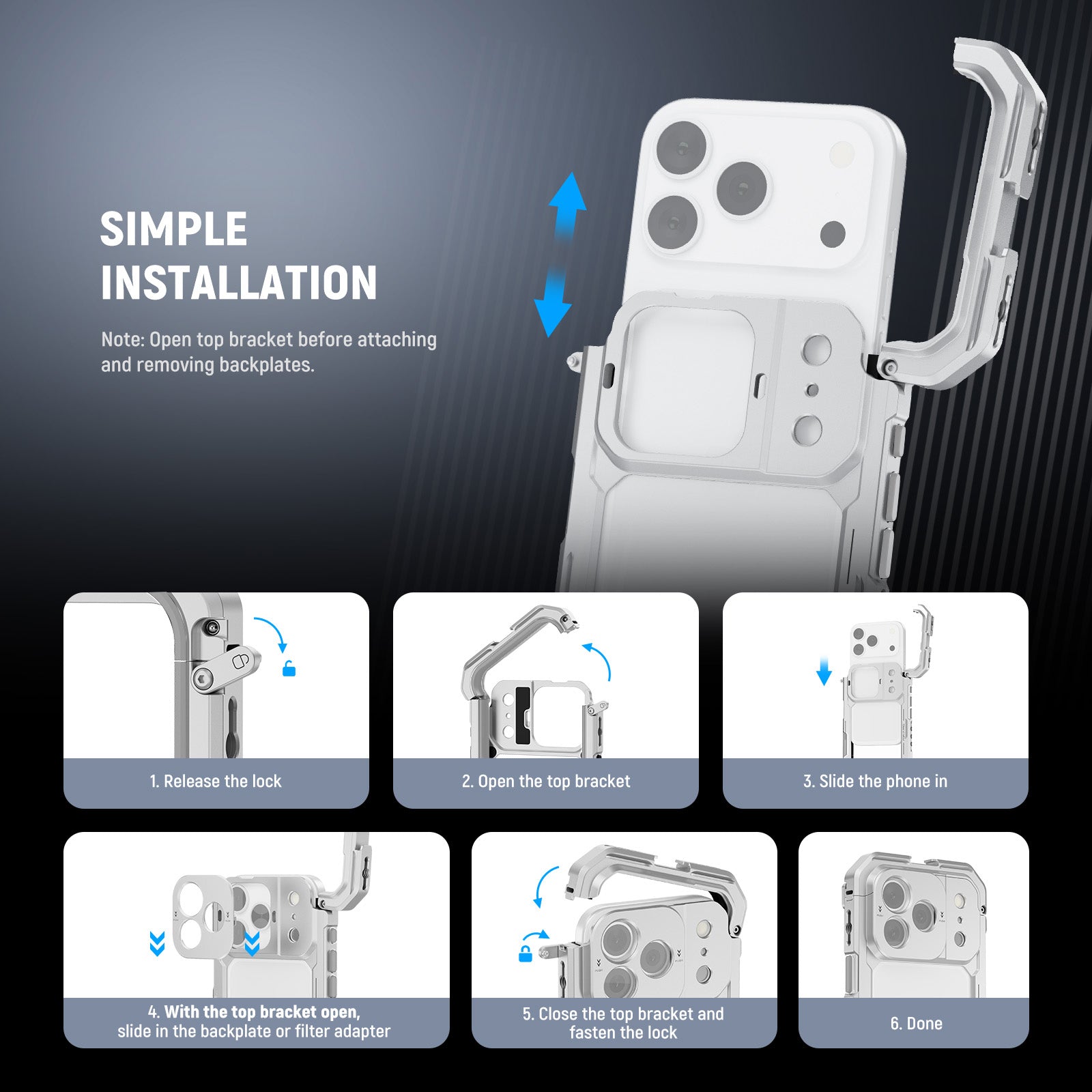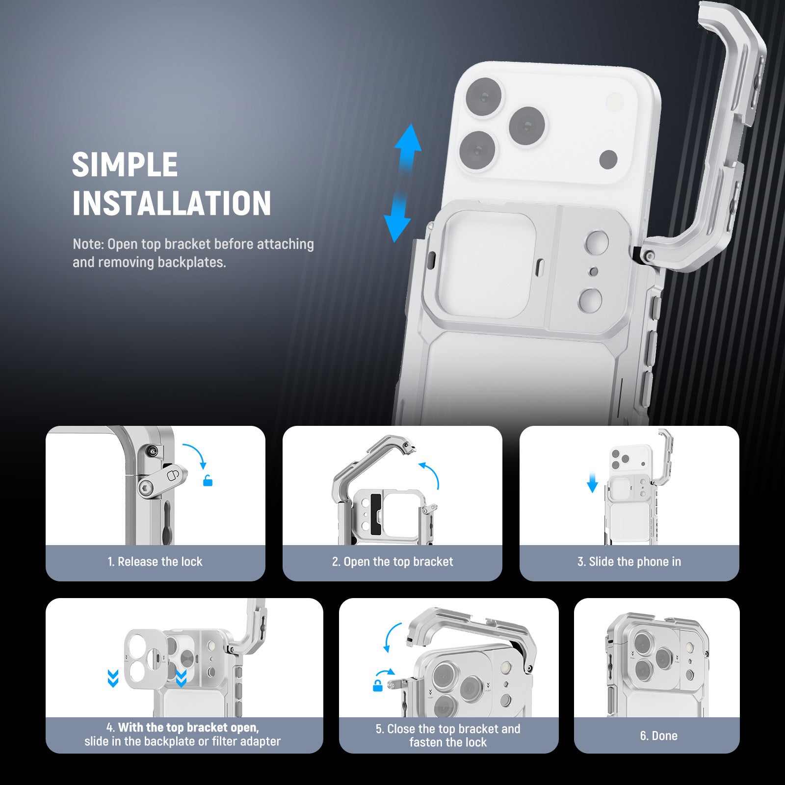 - Compatible with iPhone 17 Pro/Pro Max - This aluminum alloy cell phone cage video rig with shockproof rubber linings shields your phone during video recording, YouTube/TikTok vlogging, live streaming, mobile photography, and filmmaking like a gimbal stabilizer holder equipment as professional smartphone camera filming accessories. It includes three interchangeable backplates to connect filters and lenses for unlimited creativity. Note: Open the top bracket to install a backplate, then close it to secure