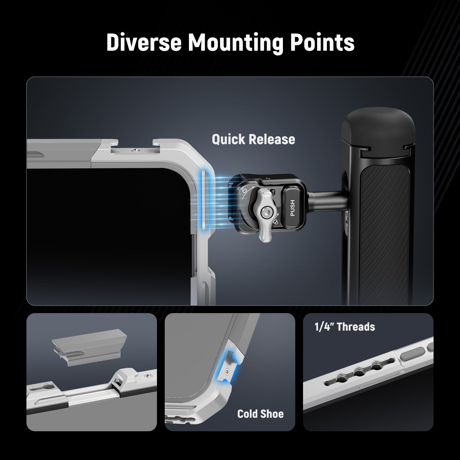 - Diverse Mounting Points - The cage features mounting slots for PA045/PA045E Quick Release Side Handle, 1/4" threads for T29/T30/T31 Tabletop Tripod, and cold shoe mounts for RGB62 Mini LED Video Light, CM31 Wireless Lavalier Microphone System, and more