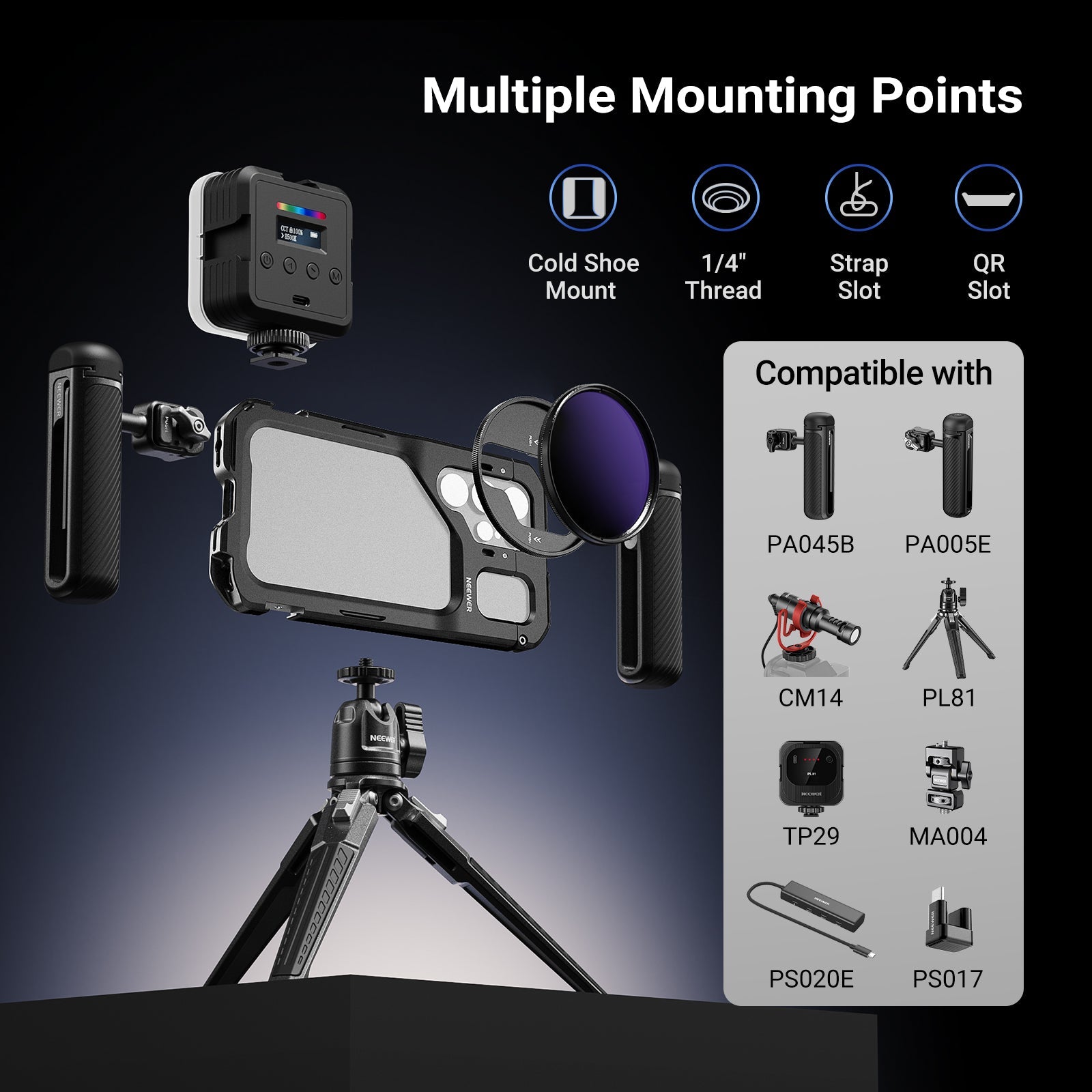 - Multiple Mounting Points- Cold shoe mounts and 1/4" threaded holes allow you to attach LED video lights, microphones, tripods, and other photography phone accessories to elevate content quality
