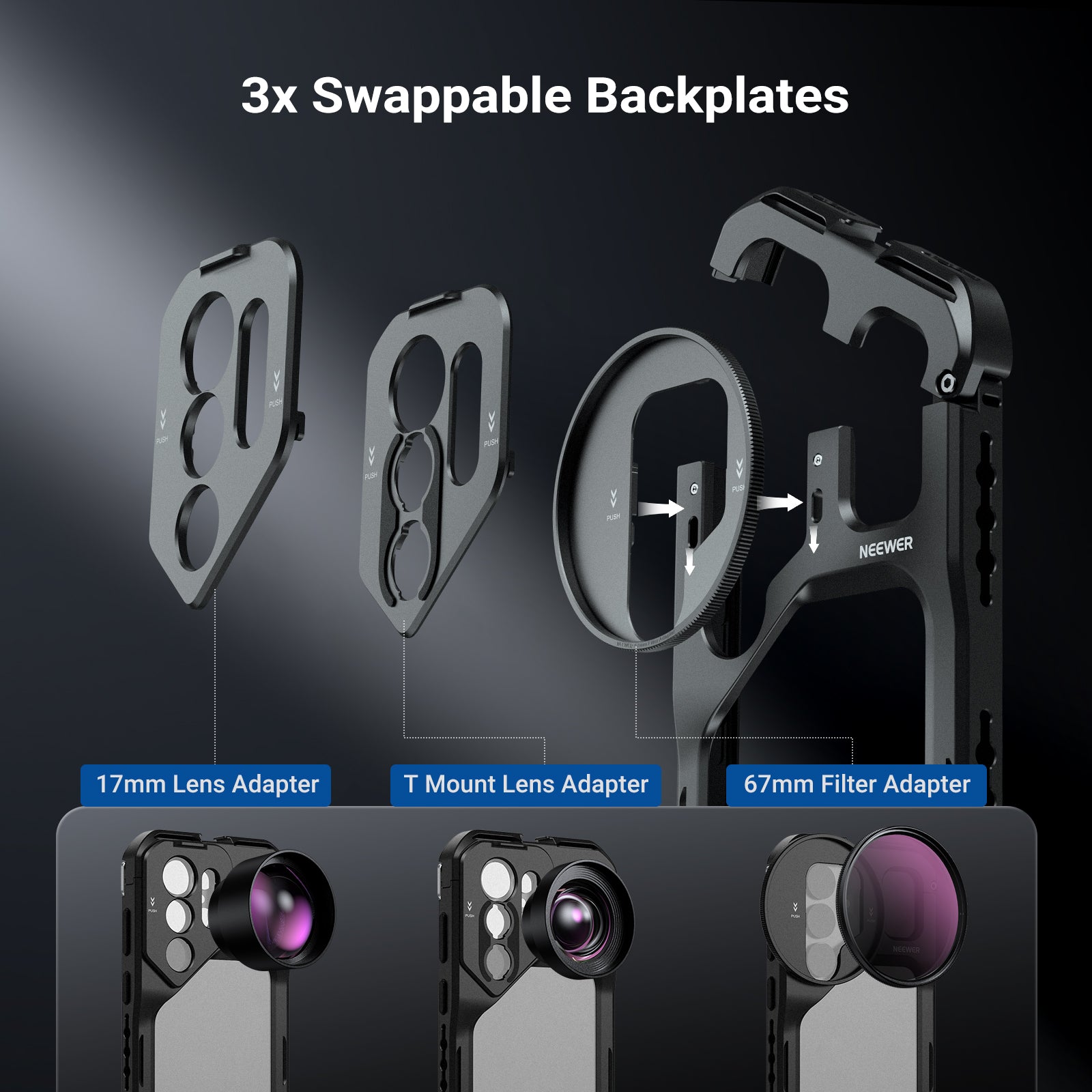 - 3x Swappable Backplates- Compatible with Moment T Mount Series lenses, 17mm phone lenses, and 67mm filters, respectively. Open the cage before installing backplates. Lenses and filters are sold separately