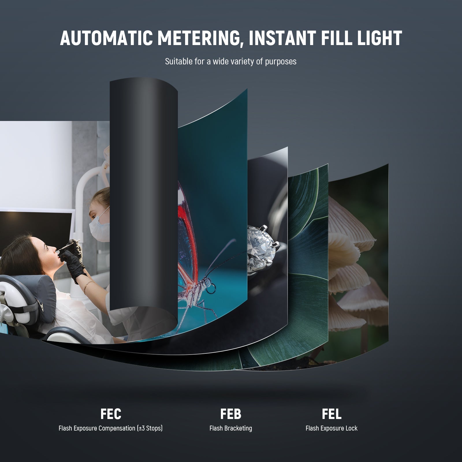 - 3 Flash Modes & Independent Flash Tubes- TTL mode automatically gets correct exposure; M mode supports 1/1 -1/128 adjustable manual flash output; MULTI mode offers creative stroboscopic flashes. A/B flash tubes are independently and collectively controllable. In TTL/M modes, the 8:1-1:1-1:8 flash ratio is adjustable in 1/2 stops for fine tuning the image contrast