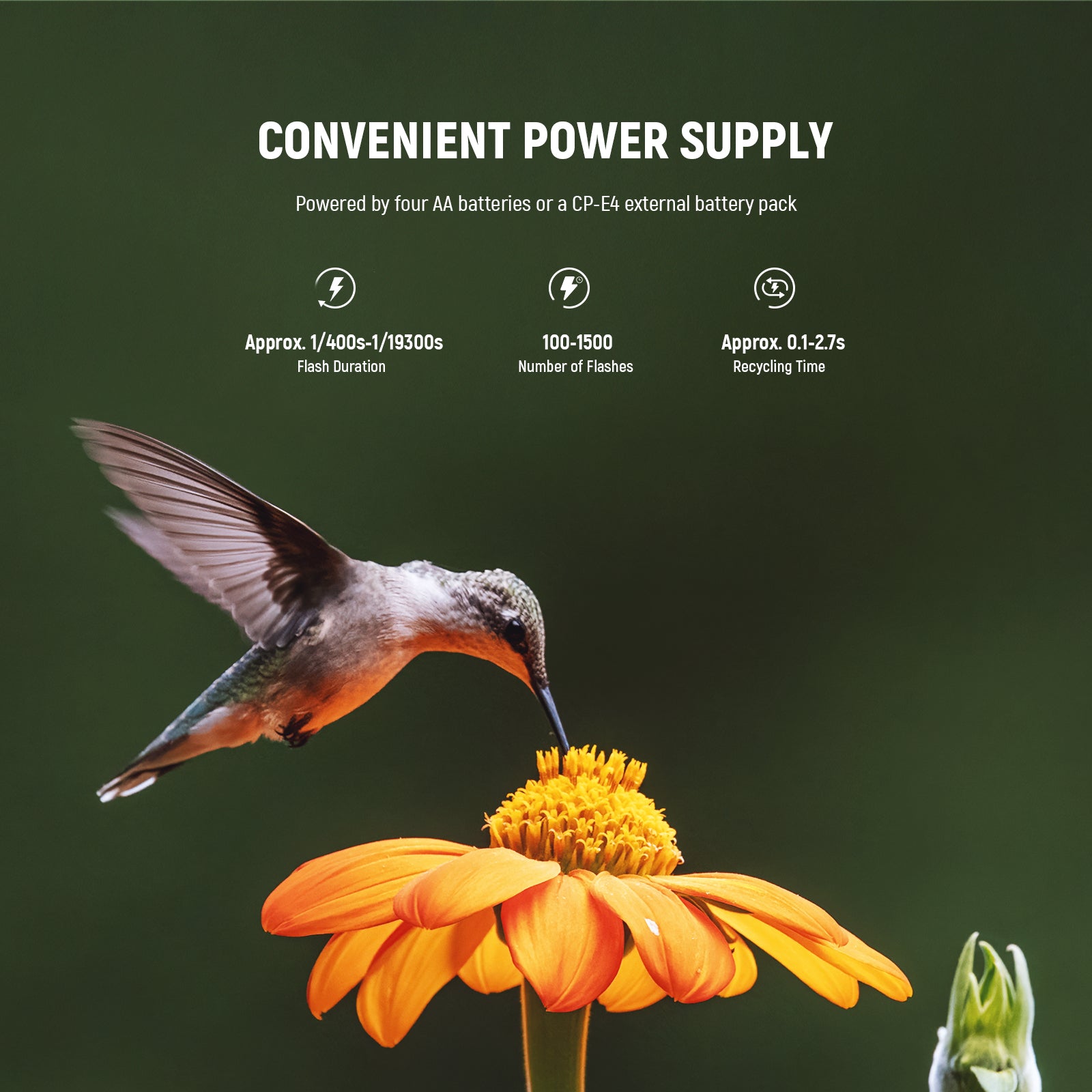 - Powerful Output with Advanced Functions- The macro flash features 76Ws output, GN15 guide number (ISO100, 1M), exposure compensation, exposure bracketing, flash lock, front/rear curtain sync, a PC sync jack, and other functions. Powered by 4x AA battery, the flash ring supports 1/400-1/19300s flash duration, 0.1-2.7s recycling time, and 100-1500 flashes, or connect the flash to an external power source via the CP-E4 port to speed up recycling time (Requires 1.5V high-drain rechargeable or alkaline batteries for power supply.)