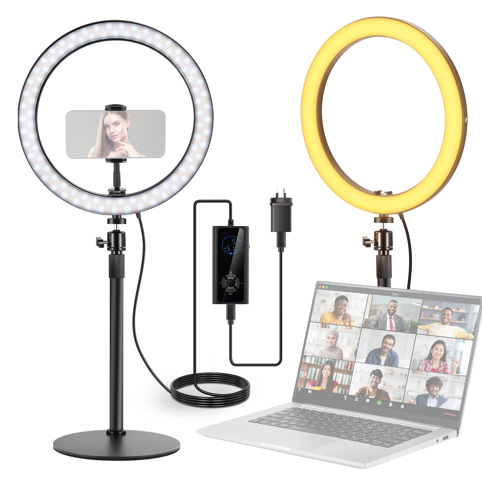 - Adjustable Desk Stand- Our selfie circle halo ring light kit includes an adjustable desktop stand ranging from 11"-18"/29-45cm. Easily select the desired height and rotate it to find an optimal lighting angle. Whether you're a streamer, makeup artist, or working at a table, video conferencing on a laptop/computer monitor/webcam, or filming videos, this adjustable setup provides the flexibility you need as content creator essential and influencer must have
