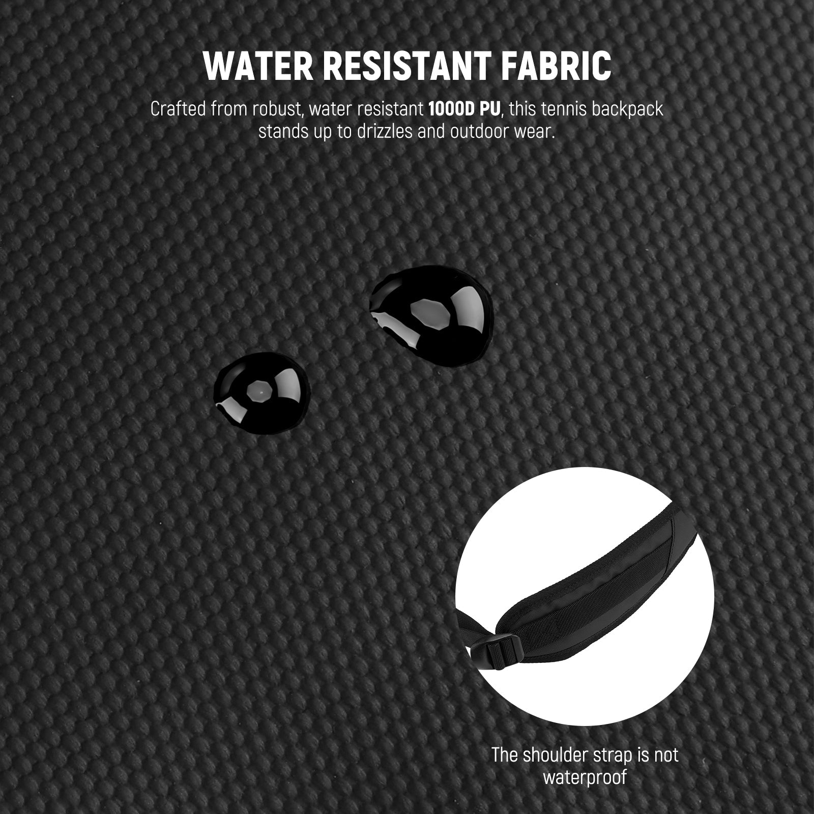- Water Resistant Fabric- Crafted from robust, water resistant 1000D PU, this tennis backpack stands up to drizzles and outdoor wear. Smooth, heavy duty zippers offer reliable performance through daily use