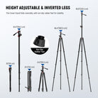 - Transform into a Monopod- One of the tripod leg tubes can be quickly disassembled and connected with the tripod head to transform into a monopod, offering extra flexibility for shooting in tight spaces, allowing photographers to capture unique angles and compose shots with ease. The height of the monopod is adjustable from from 22.2 inches (56.5 cm), 65.4 inches (166 cm) and 94.5 inches (240 cm). The foam grip ensures added comfort and a secure hold, preventing slippage during use