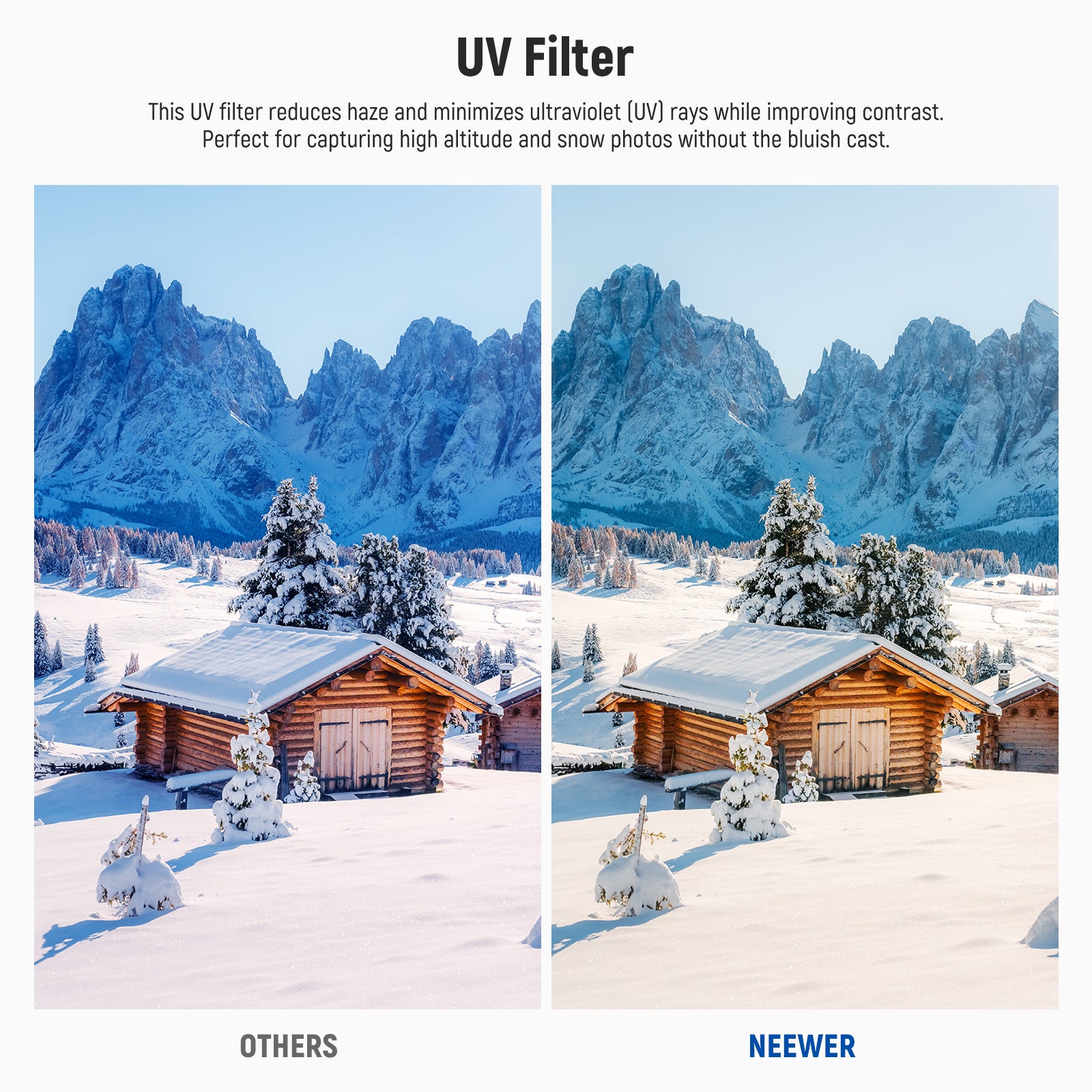 - Protective UV Filter- This UV filter reduces haze and minimizes ultraviolet (UV) rays while improving contrast. Perfect for capturing high altitude and snow photos without the bluish cast. Keep this filter on your lens to protect against dust, scratches, fingerprints, and bumps