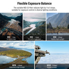 - Flexible Exposure Balance- The variable ND2-32 and ND64-512 filters reduce light by 1 to 5 stops and 6 to 9 stops, respectively, suitable for exposure control in diverse lighting conditions. They allow you to capture rivers, waterfalls, and light trails with dynamic motion blur—adding a cinematic touch to your drone footage